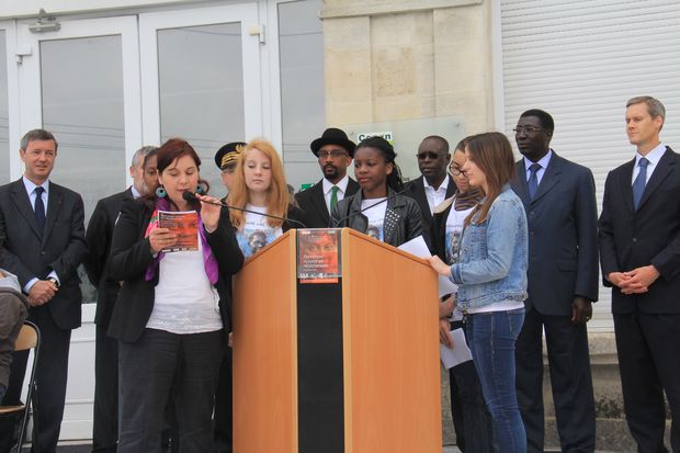 Au milieu des personnalités officielles; Michel Delpuech, Préfet d’Aquitaine, Malick Ndiaye, Ministre-Conseiller du Sénégal,  Michèle Delaunay, Députée  de la Gironde,  Mbaye Lo Tall, Consul Général du Sénégal à Bordeaux, Thomas Wolf, Consul Général des USA à Bordeaux,  Olivier Dugrip, Recteur de l’Académie de Bordeaux…  et Marie Laure Piroth, et six de ses élèves. Ce petit groupe motivé a travaillé son intervention dans le cadre  d’un projet au long cours, labellisé par l’UNESCO : Ecoles du monde sur la Route de l’esclave, en partenariat avec le Musée Victor Scoelcher de la Guadeloupe
