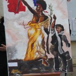 Une altière « Liberté noire guidant le peuple », tableau de la jeune artiste Anouk Goulière, réinterprétation tonique du tableau d’Eugène Delacroix, colorait le lieu de la cérémonie.